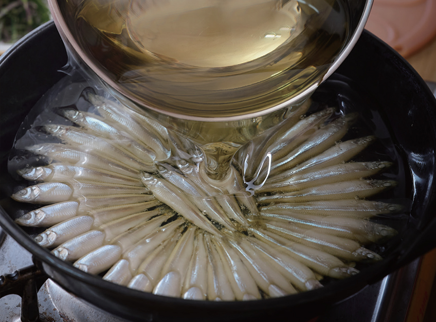 Smelts are put in a skillet evenly and then boiled. Fry the boiled smelts until they turn golden in oil.