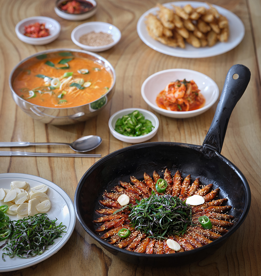 Generously glaze the fried fish with spicy, sweet and sour sauce, place plenty of sesame leaves in the center, and sprinkle sesame and hot pepper over them. A plate of doribaengbaengi looks colorful and appetizing. Eat stickily clotted smelt one by one with sesame leaves and hot pepper. The more you chew the flesh of seasoned smelt, the more savory the taste. This dish even attracts nearby residents to go out of their way to eat it, with doribaengbaengi’s health benefit said to last three days.