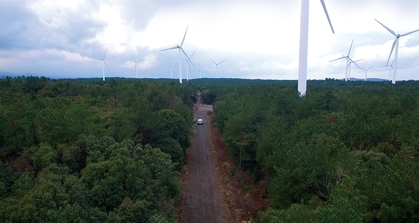 An extraordinary experience is taking a temporary forest road while riding an electric car and looking at spinning windmills.