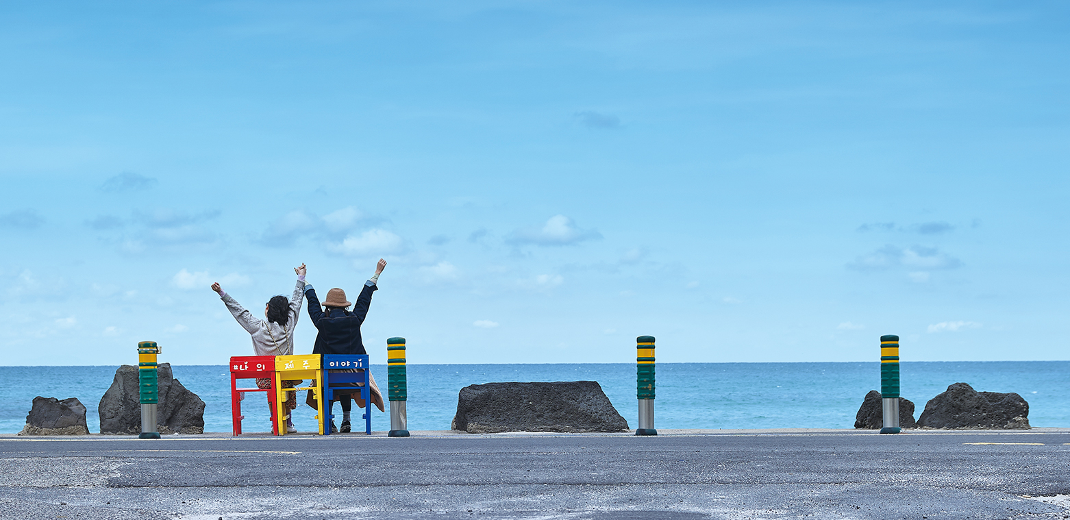 Driving on a coastal road where the sky and the ocean seem to be one, head toward Seongsan Ilchulbong (Sunrise Peak). Ninety-nine rocky peaks that surround the sunken crater at the top look like the high walls of an impenetrable fortress, from which the name “Seongsan” originated. While charging an electric car at a nearby station, hike up the cone. Looking back after walking up a neatly established path for a while, the landscape of Jeju will seem to have expanded a few inches at a time below your feet. Descend on stairs heading toward the beach to reach Haenyeo House, where the island’s female divers haenyeo perform at sea. Despite no stage, the performance is nonetheless meaningful just with the appearance of the divers, who have lived their entire lives around the island’s waters.