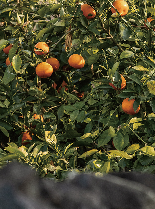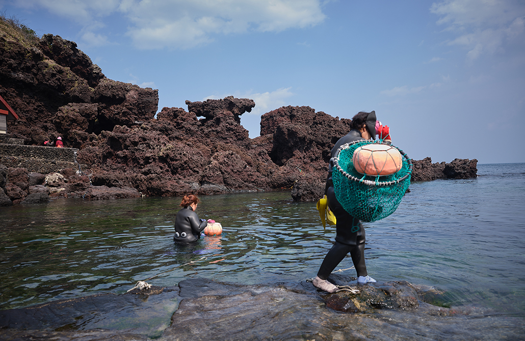 With weather permitting from Seongsan Ilchulbong (Sunrise Peak), one can see twice a day a group of haenyeo (female divers) going under water to catch shellfish. / Tangerines hang over a stone wall while exposed to rain and wind.