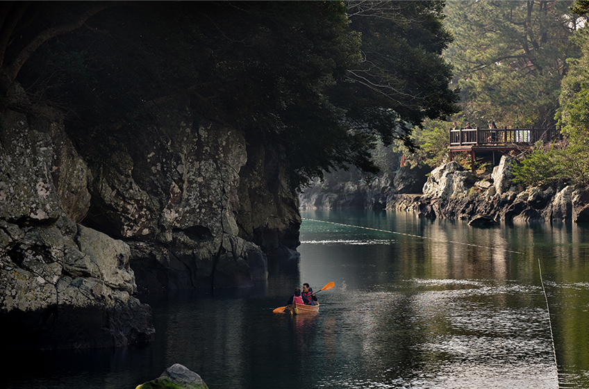 A stream of water flowing down from Hallasan Mountain becomes Hyodoncheon Stream in the island’s southern region. The small dry stream is still a beautiful place created by lava and decorated by beautifully shaped rocks and cliffs. At Soesokkak Estuary located at the stream’s mouth, strange-looking rocks stand tall on the sides like screens and a forest grows thick over them, which completes a mystical view. The name “Soesokkak” also comes from Jeju dialect, with soeso meaning a “pond where a bull lies” and kkak meaning the “final end.” A blue pond appears between the rocks and trees and laughter is heard from people enjoying the scenery of the estuary and stream on a boat.