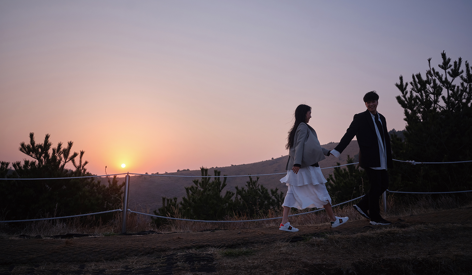 The island takes on an impressive appearance when the sun begins to set. The sunset featuring colorful shades slowly spreads between volcanic cones and over the horizon, enlightening and inspiring those who gaze at it. On the way up Darangswi Oreum, you will encounter the impressive beauty of Jeju, the balance formed by the peak, the sunken crater that looks like the moon and the lovers who complete such a gorgeous scene on the island. Hiking up the cone just in time to see the sunset, couples hold hands and walk, relaxing or sitting side by side to share the wind, sea and sunset. JMG Le Clézio, the winner of the 2008 Nobel Prize for Literature, once said the most impressive thing about Jeju is its beauty. As more people abroad discover the beauty of nature on Jeju, efforts for the protection and preservation of nature on the island are more pressing than ever. Projecting the nature of the island’s original form into daily life as is instead of forcibly bringing it to the present and going beyond modest acts for protecting nature to effectively coexist with it.