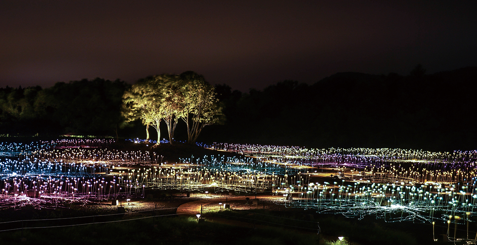 Six eminent international artists there display 14 of their artworks, starting with Bruce Munro’s “Oreum.” The title is the Korean term for “volcanic cone,” Jeju’s most unique geographical feature. The canvas stretches to 20,000 m2 with small and big splashes of light symbolizing oreum, a mystical fable of the island. Another piece, Tom Fruin’s “Odumak,” also uses the Korean name for “cabin.” When a small cabin made with quilted glasses is reflected on the lake’s surface, passers-by stop in their tracks to take in this gorgeous sight.