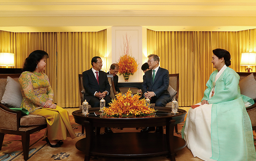 President Moon Jae-in and first lady Kim Jung-sook on March 14 hold a meeting with Cambodian Prime Minister Hun Sen and his wife Bun Rany in Phnom Penh.
