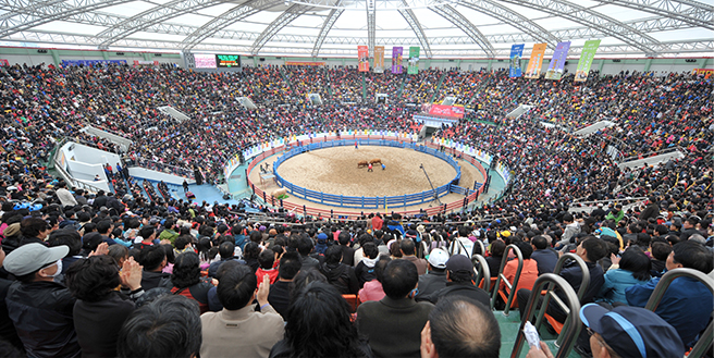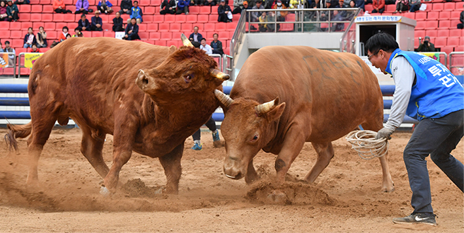 Cheongdo-gun County, Gyeongsandbuk-do Province, hosts the annual Cheongdo Bullfighting Festival every spring. Korean bullfighting dates back to long ago when agricultural culture became predominant on the Korean Peninsula, expanding from a simple form of entertainment for shepherds to a fierce competition among clans with bragging rights at stake.