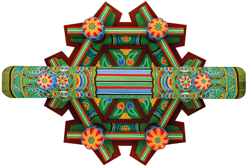 Unlike China, which used red, and Japan, which used grey and black, Korea utilized blue, red, yellow, white and black, the five cardinal colors that represent wood, fire, earth, metal and water, respectively, based on yin and yang and the Five Elements Theory. As Daniel Tribouillard, CEO of the French fashion brand Leonard, said, “The bold combination of vivid pink, blue green, yellow and purple is something I’ve never seen in any other part of the world.” Thus the colors used in dancheong is unparalleled. In addition, dark red pillars, green leaves, white and black stripes, and repetitive red and blue geometric shapes combine and contrast principles of nature and art.