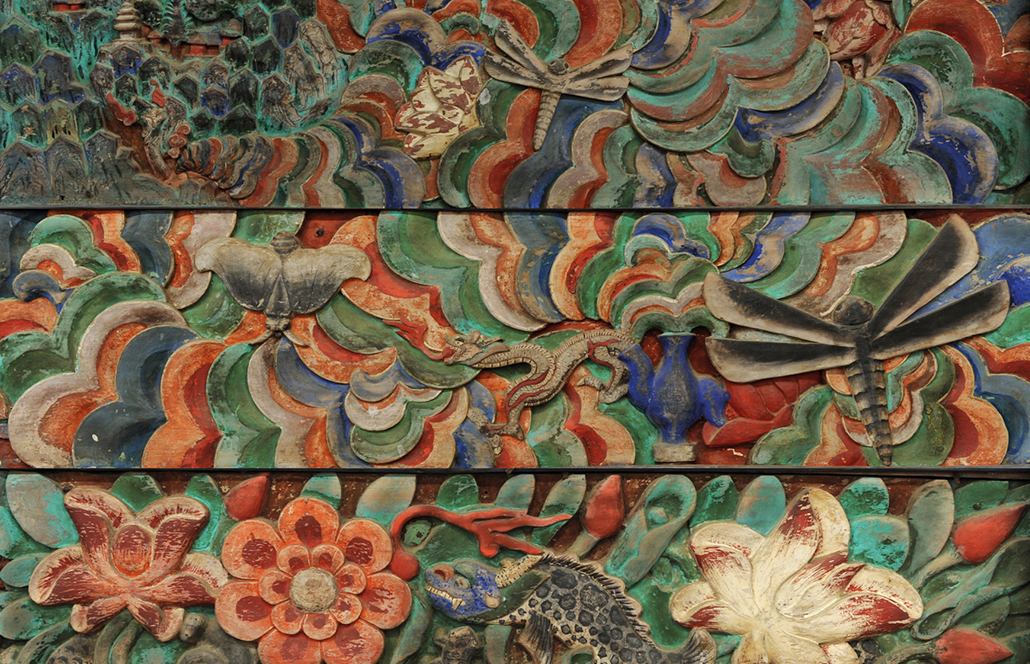 Dancheong refers to traditional coloring on wooden buildings and artifacts in Korea for decoration and style, a style that can be seen on ancient murals from the Goguryeo Kingdom era (37 B.C.E-668 C.E.); it was also recorded in the ancient book “Samguk Yusa (Memorabilia of The Three Kingdoms).” Thus the origin of dancheong design can be traced back to the period of the Three Kingdoms of Korea (57 B.C.E to 668 C.E.). For centuries, this art has been used in architecture, painting, sculpture and assorted crafts. Its usual function was to cover design defects and prevent cracks in wooden buildings, in addition to repelling pests and protecting from rain and wind. Sacred places like temples or palaces adopted a variety of dancheong patterns and radiant colors to accentuate their designs.