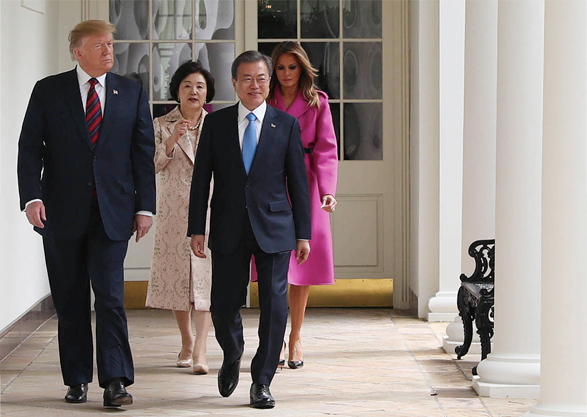 President Moon Jae-in and first lady Kim Jung-sook on April 11 walk with U.S. President Donald Trump and first lady Melania Trump along the Colonnade of the White House.