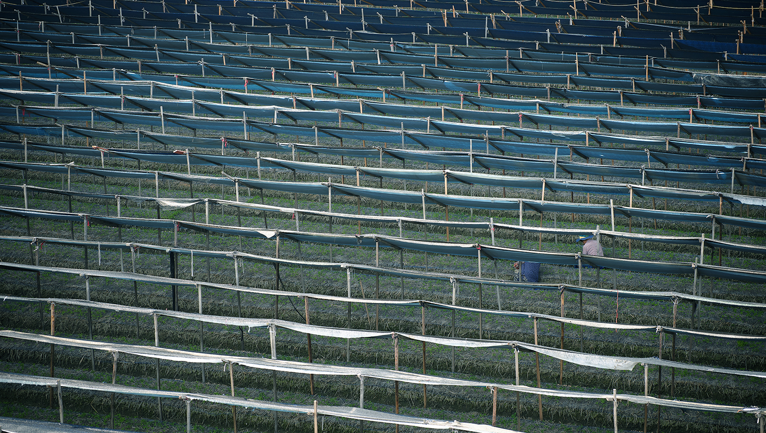 Farmers are working in Geumsan’s shaded ginseng farm.