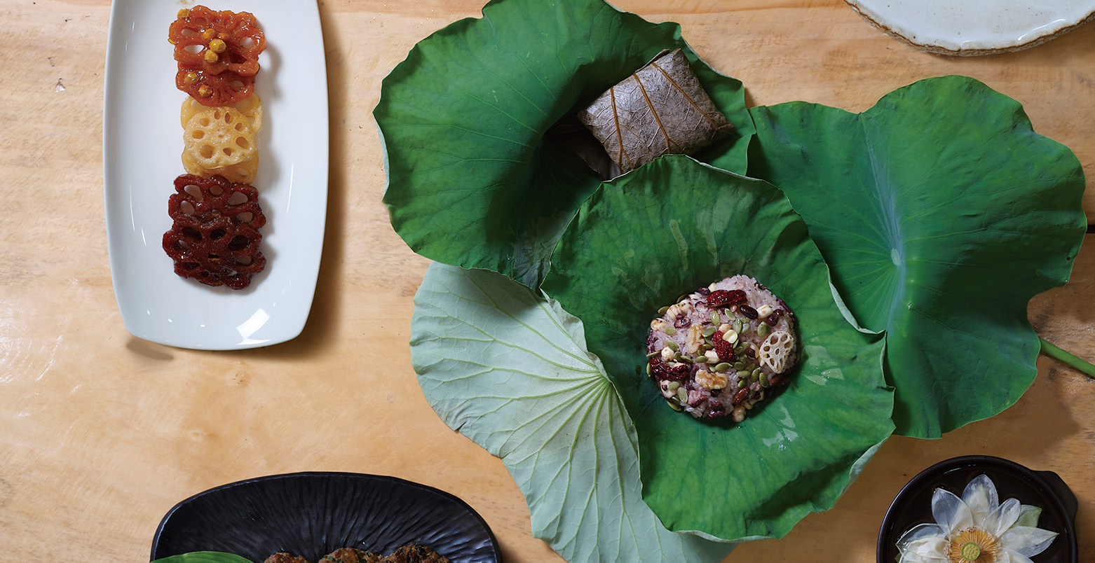 at the pond, the county is famous for cuisine featuring neatly prepared dishes made with lotus.