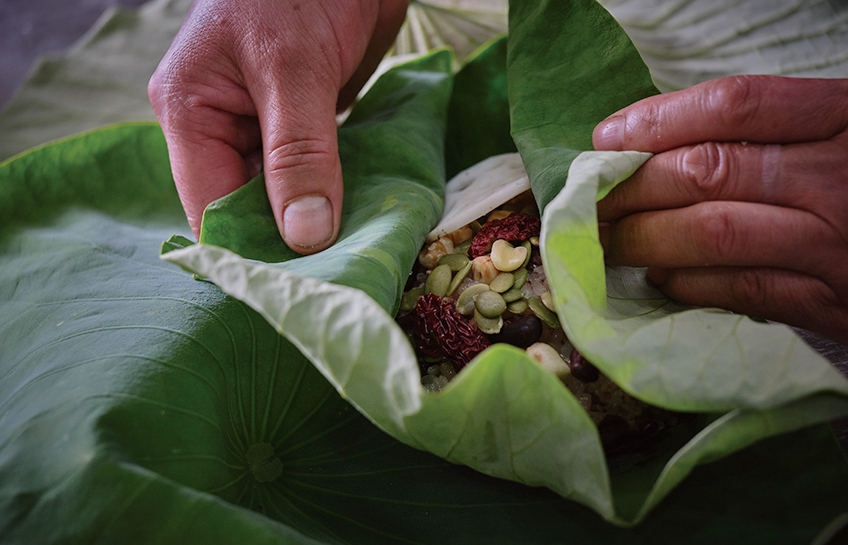 Rice wrapped in a lotus leaf and steamed gives a strong flavor.