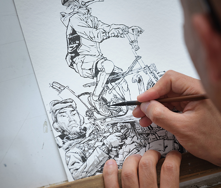 The artist said his most challenging projects are always history related because they require heavy research. His most stressful was one he did in Angouleme, France, where he took a work on Korean women forced into sexual slavery by the Japanese military during the Second World War. Because of the sensitive topic and his lack of in-depth knowledge of it at the time, he said he feared that the work would make him vulnerable to bias and criticism regardless of his intention. After rejecting it a few times, he was finally persuaded by his friends and fellow artists that he must take on the work. Even after he agreed to do it, the pressure hardly waned as reporters from the Japanese media outlet NHK watched him. Though he said he never wants to experience that kind of pressure again, this small desk-size project is the most memorable to him precisely because of its difficulty.