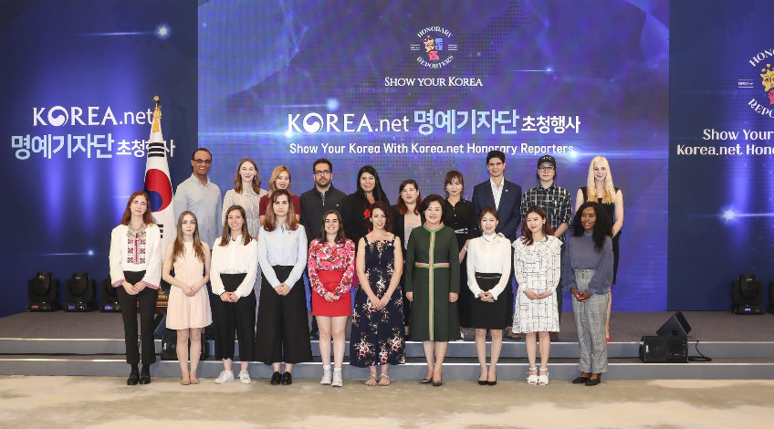The First Lady Kim Jung-sook is taking a picture with Korea.net honorary reporters.