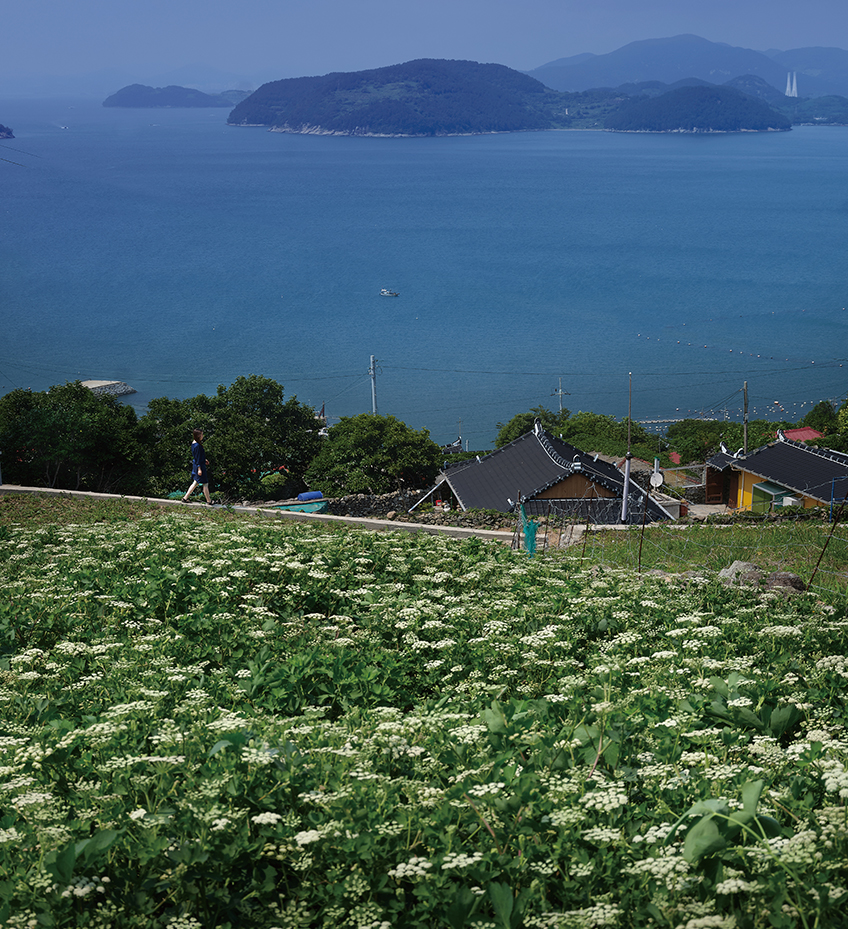 With white flowers in full bloom, siler roots, a medicinal plant of the Umbellifer family, welcome visitors who travel by sea to Geumodo Island.