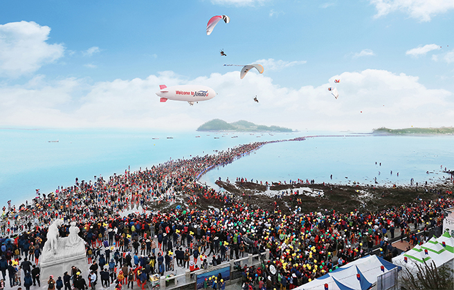 A marvelous natural spectacle lasting just one hour occurs once a year in Jindo-gun County, as rape flowers begin to blossom. As the tide goes out, the sea mysteriously parts and a hidden pathway as long as 2.8 km appears. This 40 meter-wide road connects the main island to a smaller nearby island and serves as an open stage for performances of traditional Korean music. Visitors can also search for sea creatures like clams, octopus, conch or abalone.