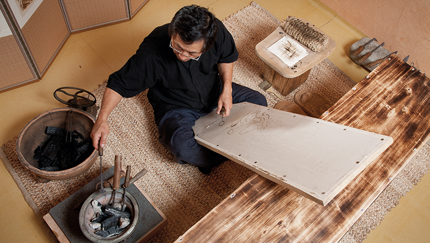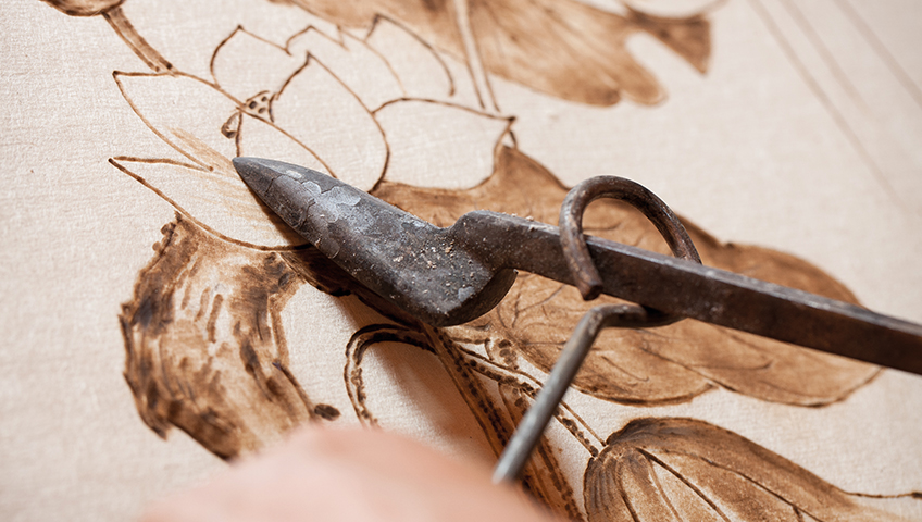 nakhwa is a type of pyrography through which a painting is produced using a soldering iron on a canvas made of paper, silk, wood or leather, with the nicknames “iron painting” and “fire painting.” This art form almost went extinct until its artistic value was recognized in 2010, when nakhwa master Kim Youngjo was designated Intangible Cultural Heritage No. 22 of Chungcheongbukdo Province. In January this year, nakhwajang (wood burning technique) saw a huge boost in public awareness after being named National Intangible Cultural Heritage No. 136.