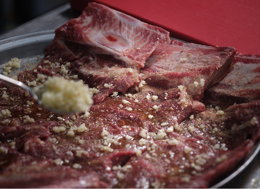 Suwon galbi uses salt instead of soy sauce for seasoning. Though each restaurant offers its own recipe, a rule of thumb is to mix five parts sugar with one part salt. When the meat is seasoned, score from one side to the other and keep the meat flat. After scoring it horizontally, marinate it for two days to make the ribs juicy and flavorful. The last step is to grill it over charcoal and enjoy.