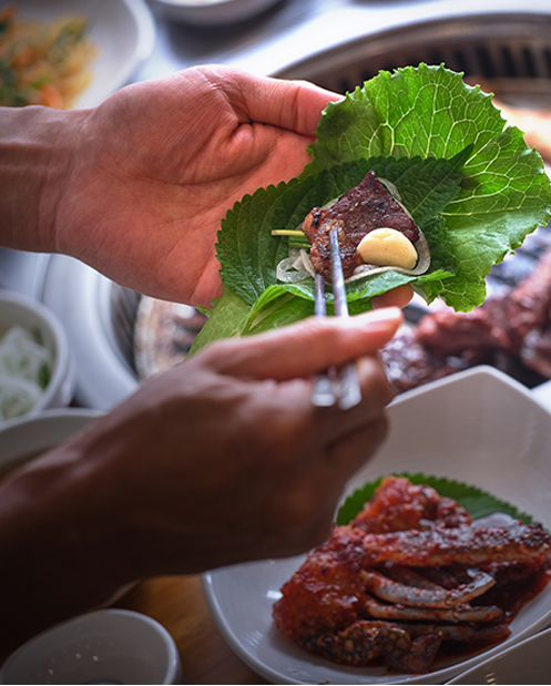 Putting freshly grilled ribs in lettuce wrap is a major part of galbi culture.