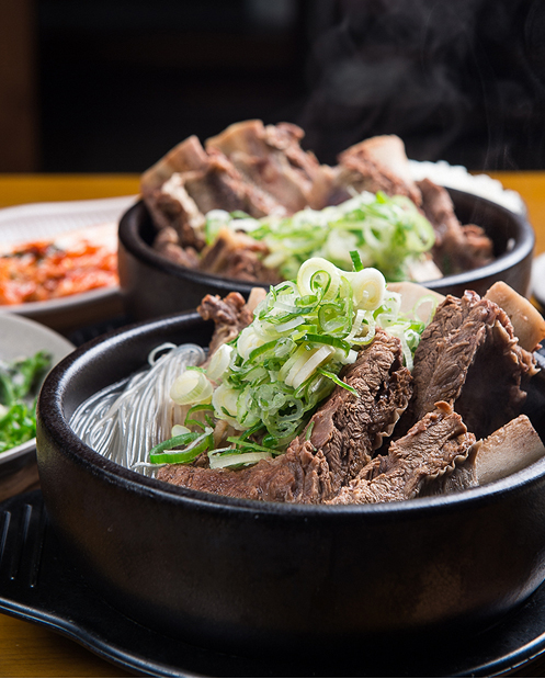 Galbitang (short rib soup) is one of the most popular health foods served to the elderly or young men who briefly come home from military service; this is because ribs have traditionally been an expensive ingredient. People also eat this hearty soup to restore their vitality. While grilled galbi offers the savory taste of ribs, galbitang is much simpler and filling. The same ribs used in grilled galbi provide a more unique experience.