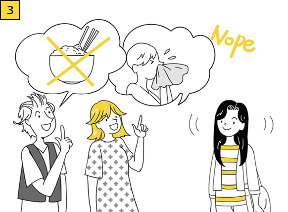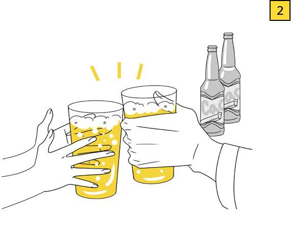 Su-hyeon: Younger people usually don’t grab their dining utensils and eat until the older people at the table do so. When pouring or receiving alcohol from someone older, one must hold their cup or bottle with both hands. When drinking, one must slightly turn his or her back to the older people at the table.