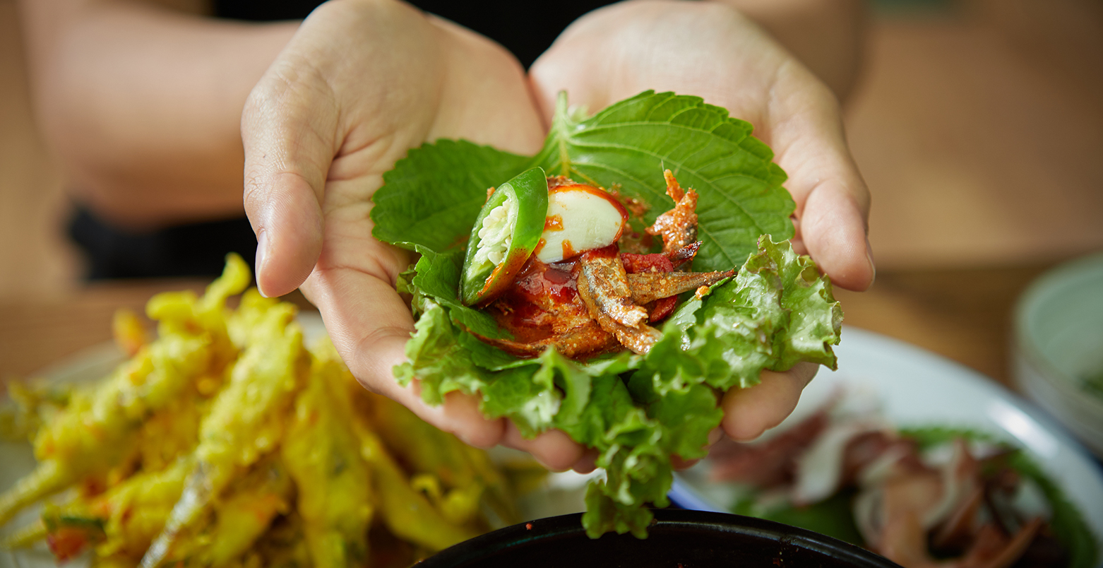 Anchovy wrapped in green vegetables originated from anchovy stew. The dish involves eating vegetable-wrapped boiled anchovy together with soybean paste. Seeing anchovy eaten as sashimi or boiled food in the city is rare but those caught in the coastal waters of the province are second to none as ingredients because they are bigger and chubbier. Anchovy is taken, wrapped in vegetables and boiled with red pepper powder, garlic and dried radish greens. Adding a generous helping of spicy garlic makes one feel as if he or she is back in Gyeongsangnam-do Province as the deliciously spicy seasoning is added to the tasty and soft anchovy.