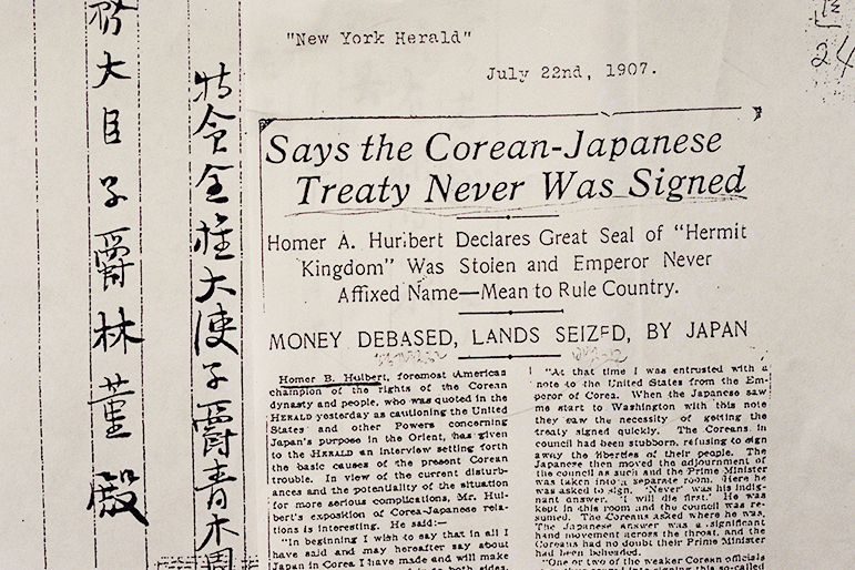 This photo shows a copy of the interview with Dr. Homer Hulbert, the foreign policy adviser of Emperor Gojong, who announced that Emperor Gojong had not signed the Japan-Korea Treaty of 1905 and that the Royal Seal had been stolen. The interview announcing this injustice was published in the “New York Herald” on July 22, 1907.Hulbert used to guard the bedroom of Emperor Gojong nightly along with Underwood after the Eulmi Incident, which saw Miura Goro, the Japanese minister to Korea, take the lead in assassinating Empress Myeongseong on Oct. 8, 1895. Armed with a pistol, Hulbert escorted Gojong at the time of the Chunsaengmun Incident, in which the emperor, who was under constant threat, tried in vain to go to the American legation in Korea with the help of pro-Americans on Nov. 27, 1895.