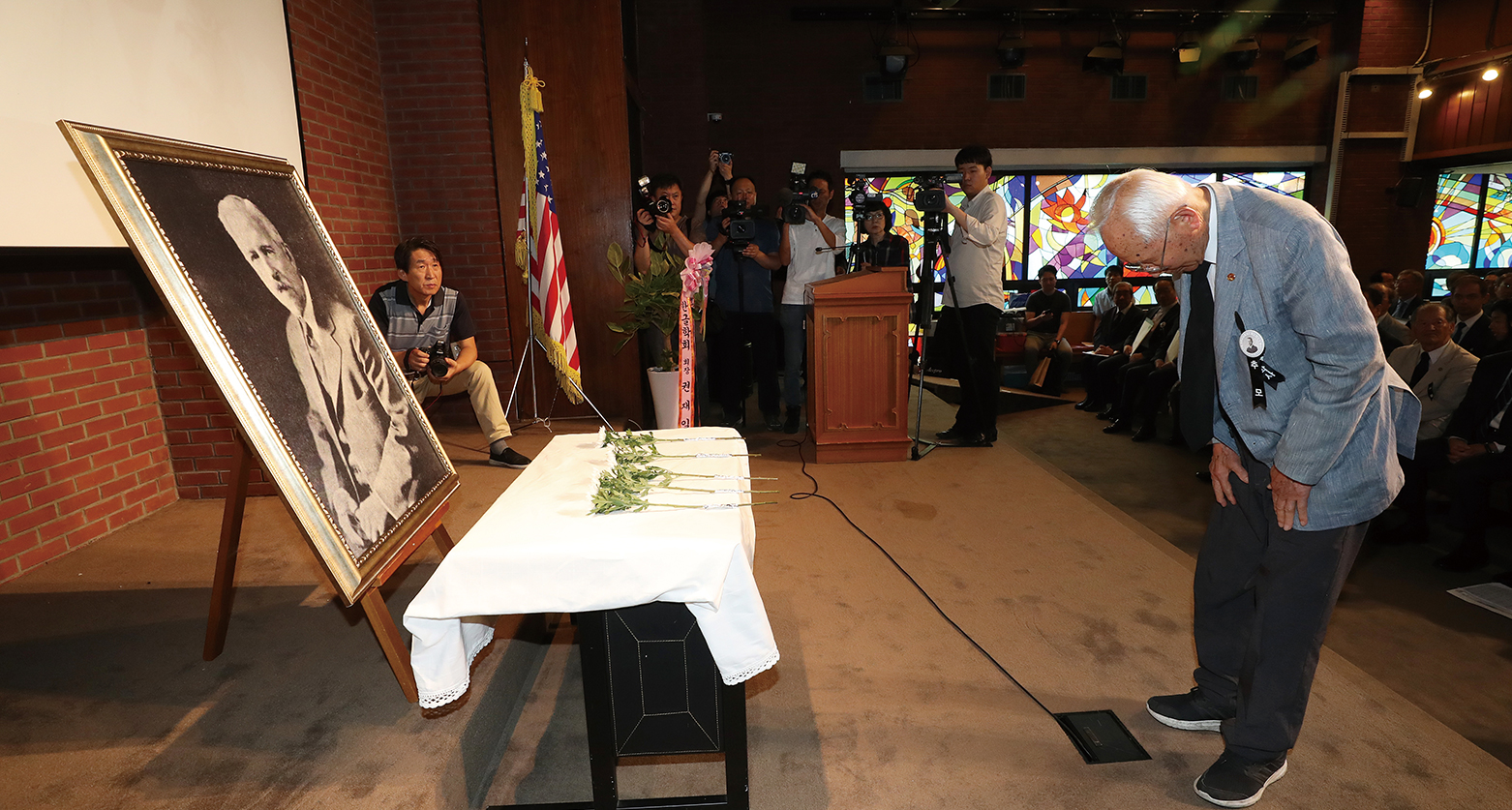 The ceremony for the 69th anniversary of Dr. Homer Hulbert’s death was held at the Yanghwajin Foreign Missionary Cemetery in Mapo-gu, Seoul on August 10. Independence patriot Lim Woo-chul bows his head in a silent tribute after his floral offering.