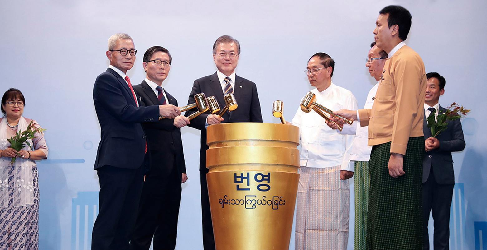 On Sept. 4. President Moon Jae-in attends the groundbreaking ceremony for an industrial complex and a business forum held in Yangon, Myanmar.