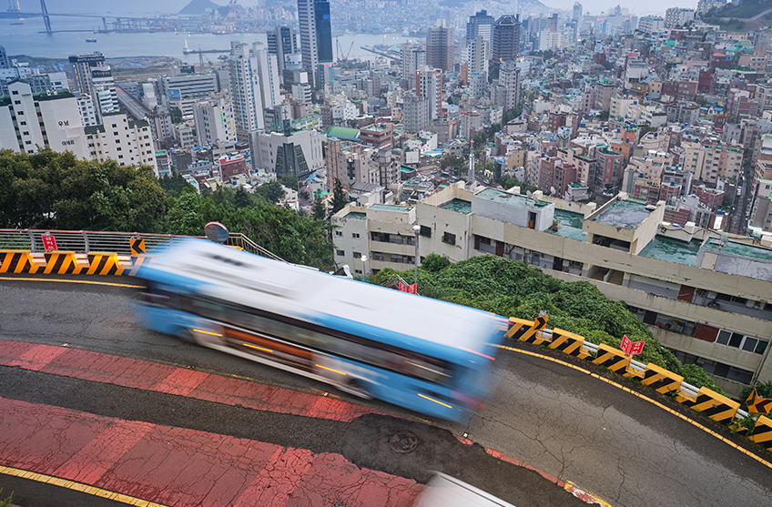 To explore inner Busan, I took an intra-city bus to see the private lives of city residents. Bus No. 186 leaves Taejongdae and runs a route leading to Sasang Station via Sanbok Road. Sitting on a seat where the sun was shining, I turned my head and gazed out the window. The road curved deeply like skin wrinkles and the buildings along the road stood shoulder to shoulder.
