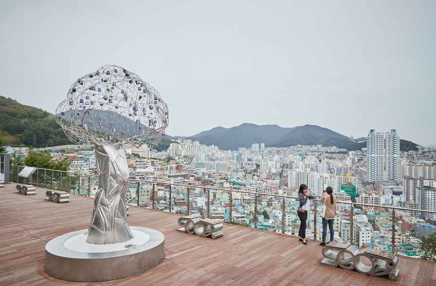 At the entrance was a gate that embodied the origin of Cheonmasan Mountain, whose name literally means “a horse that came down from heaven.” In the heart of the Nuribaragi Rest Area stood the so-called Sound Tree, which looked like a cloud hanging on a tree. A wind chime shook, emitting a clear sound. The wind was clearer and bluer since it passed over the seas of Busan. The observatory offered a full view of Yeongdo, Namhangdaegyo Bridge and Taejongdae to the left and Seomyeon and Yongdusan Park, Busan Tower and Yeongdodaegyo Bridge to the right. Magnificent views of Busan as seen here seemed like masterpieces of art.