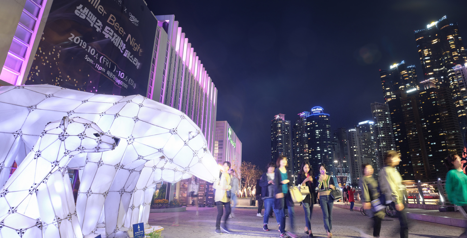 The night view at Centum City is dazzling, vibrant and brilliant, with sparkling lights constantly embroidering the outer walls of