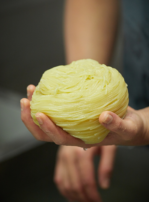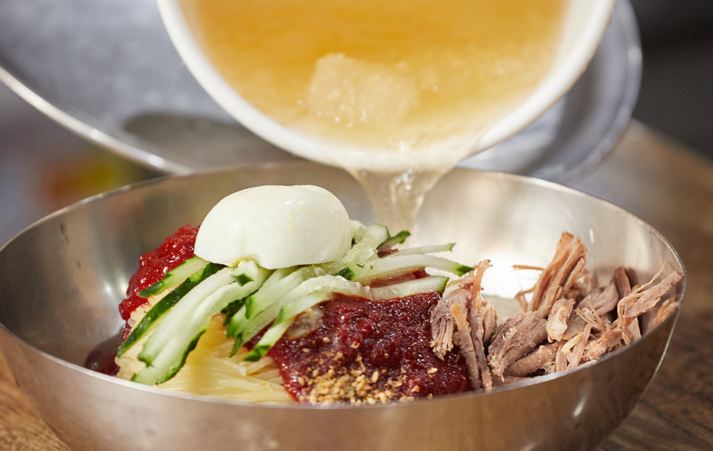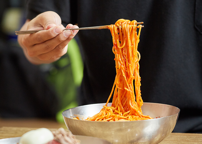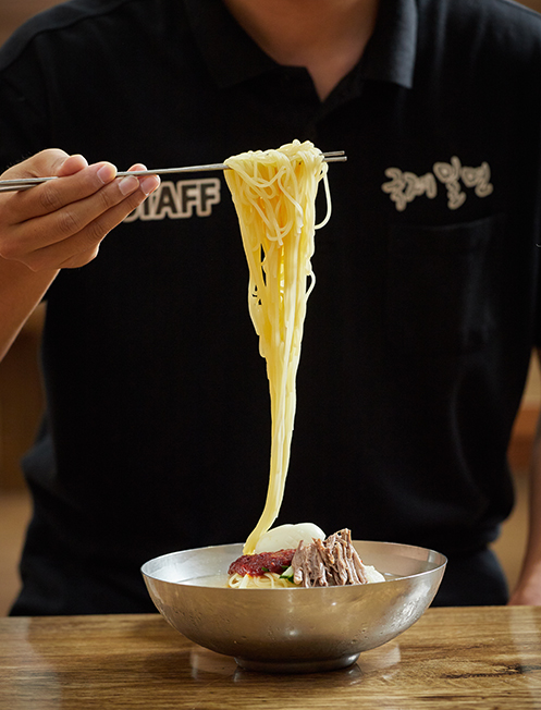 Once the noodles are ready, they are boiled, rinsed several times in cold water and rolled up to be placed in a bowl.The two kinds of milmyeon are water milmyeon, or noodles in water, and bibimmyeon (spicy noodles), or noodles mixed with gochujang (red pepper paste). No major difference exists in ingredients, but in general, water milmyeon is noodles in water, and to make bibimmyeon, red condiments are poured on the noodles instead of water. Unlike naengmyeon, water milmyeon needs fewer condiments, but to taste the clean flavor of meat broth like in Pyeongyang naengmyeon, try milmyeon without adding any condiments.