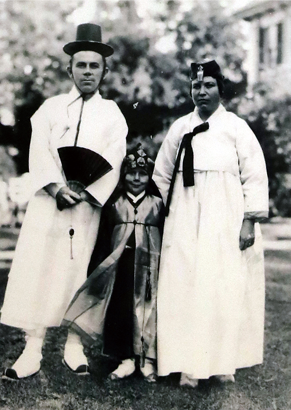 Horace Horton Underwood and his family pose for a picture while clad in Hanbok in 1923.