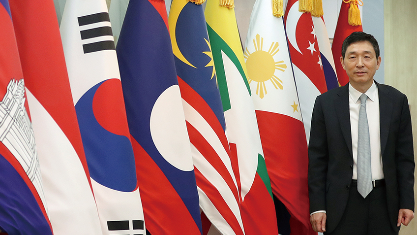 ASEAN-Korea Centre Secretary General Lee Hyuk poses with the national flags of Korea and ASEAN member states. He said his goal is to make Korea and ASEAN close neighbors through people-to-people exchange.