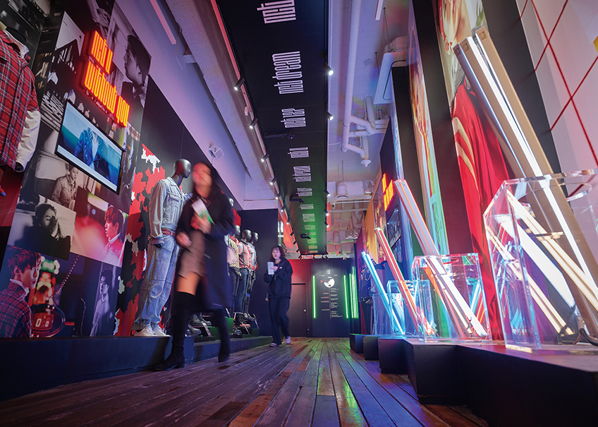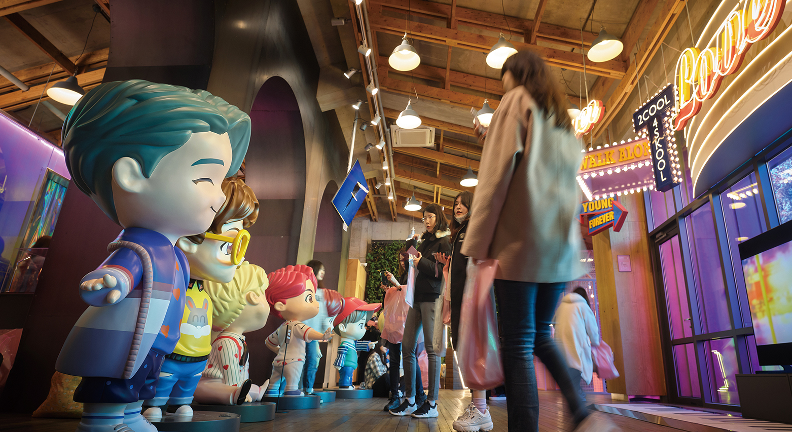 The interactive showrooms on the second and third floors are themed with views of the world and characters of BTS’s premier music videos. The themed zone “In the Mood for Love” expresses BTS’s view of the world, in which the bus stop, where the seven boys in the story “Songju Jeil Middle and High School” first meet and serves as their hiding place, was reestablished as a photo zone. In addition, attention to detail on every factor truly stands out with the floor piano that appeared in the music video for “Boy with Luv.” The piano allows audiences to play music against the background of neon decorations. Fans can thus feel part of BTS at these group-themed spaces.