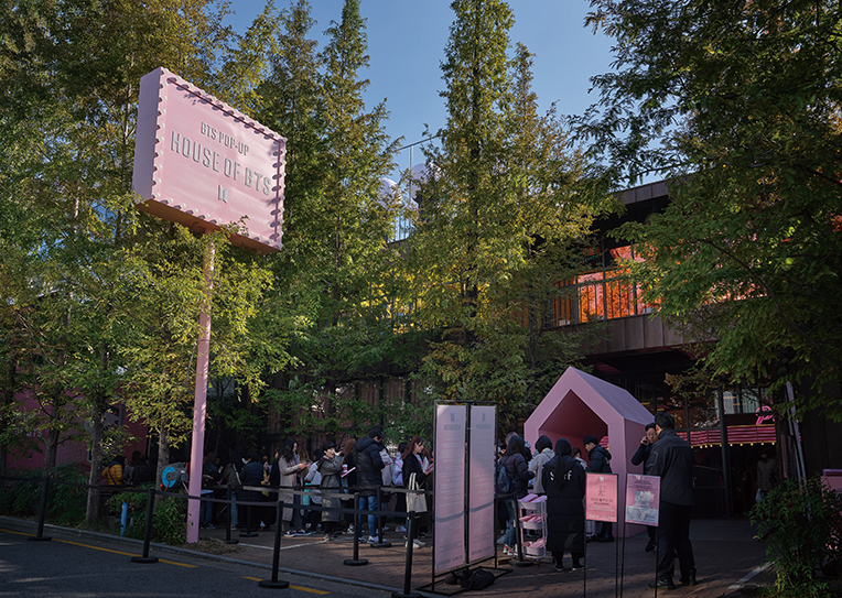 After leaving Exit 11 of Gangnam Station and walking along an alley, one can see an all-pink building known as House of BTS, a pop-up store. After stepping through the house-shaped entry gate, a row of staff dressed in pink coats greet visitors by saying, “Welcome to mi casa.”