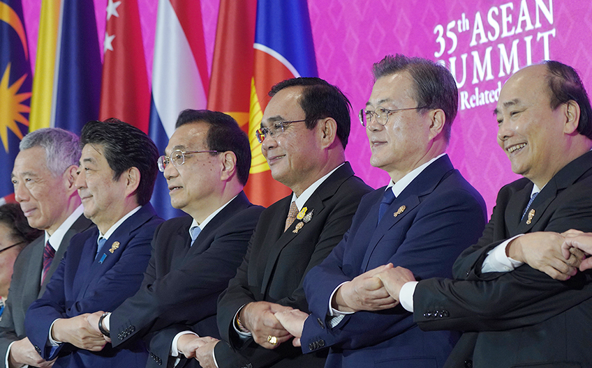 President Moon Jae-in (fifth from right) on Nov. 4 holds hands with heads of state attending the third RCEP Summit in Bangkok, Thailand.