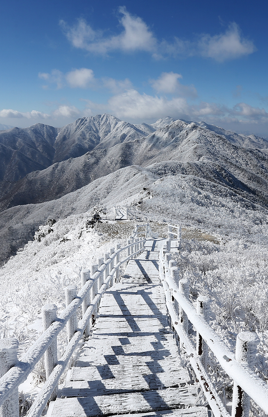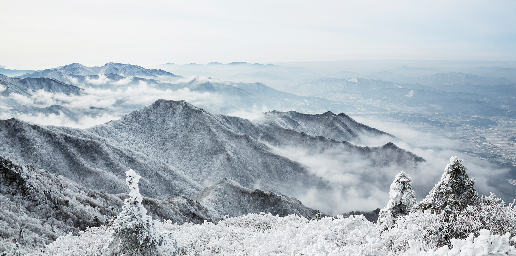 If Seoraksan Mountain is considered to be akin to a fierce waterfall and Jirisan Mountain a meandering valley, Deogyusan Mountain is like a loosely flowing river with a peak of 1, 614 meters, making it the fourth-tallest mountain in Korea. This is why many flock to Deogyusan, which sits on the border between the provinces of Jeollabuk-do and Gyeongsangnam-do and is in the Baekdudaegan, the mountainous spine of the Korean Peninsula.