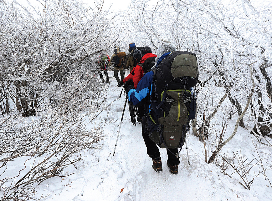 The road between Seolcheonbong and Hyangjeokbong peaks is lively thanks to the people enjoying the snow-capped mountain. They use their smartphones to take pictures of whatever scenic spots appear.