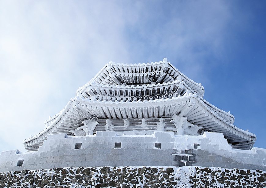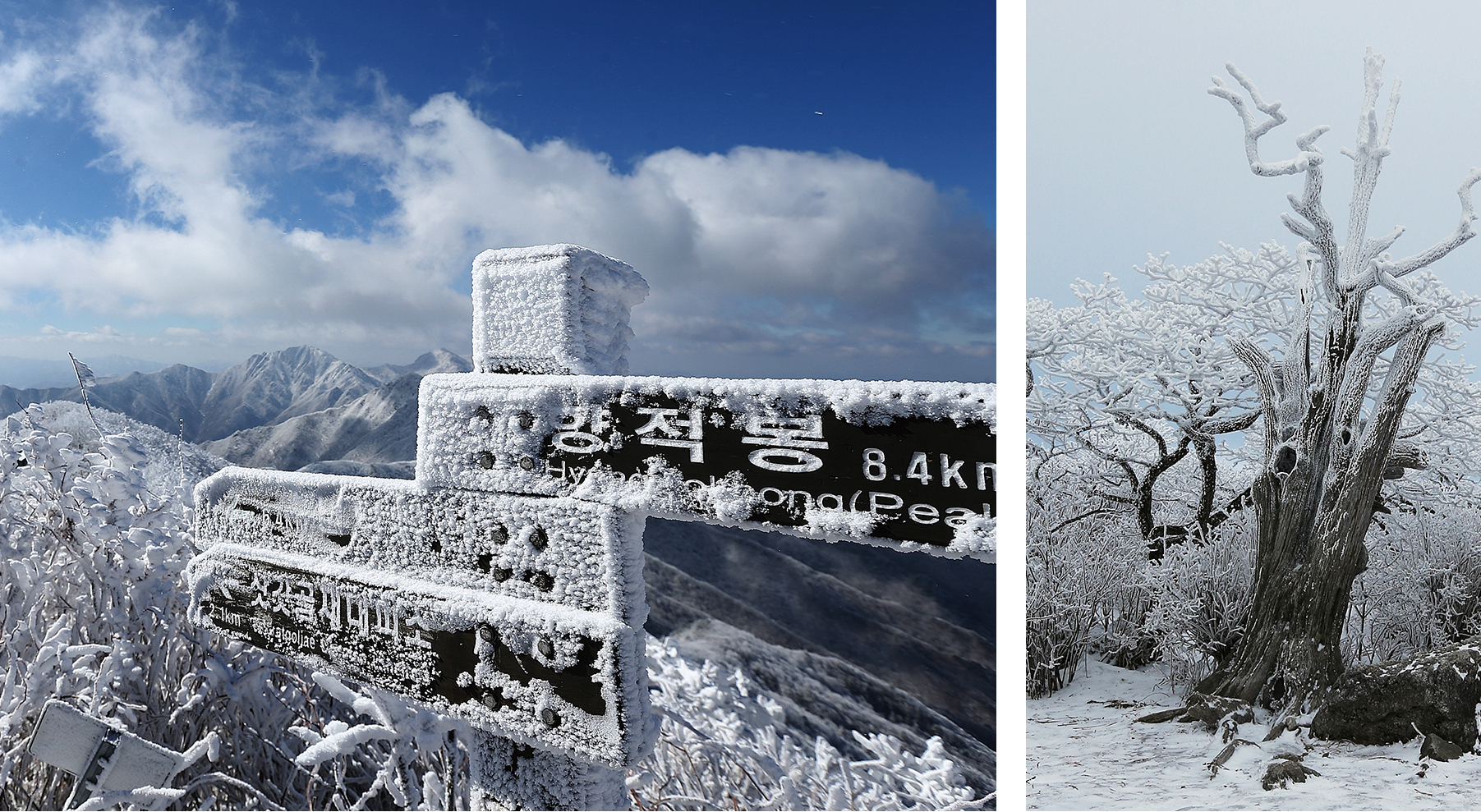 Hoarfrost, or frost that appears in crystalline form on something, is a great reason to climb Deogyusan Mountain in winter, as the entire building on Seolcheonbong Peak appears to be frozen solid.
