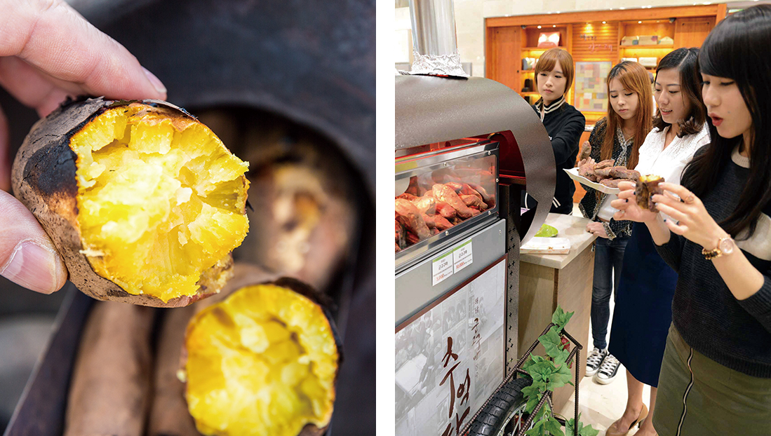 Today, the sweet potato is increasingly popular for its low calories and bountiful nutrients. Heating it up requires neither more ingredients nor tools besides an oven. Further simplifying the easy preparation process, even pots specifically designed for roasting sweet potatoes were introduced. Pumpkin sweet potatoes are moister and thus better for consumption than chestnut sweet potatoes. To make up for sweet potatoes’ dryness, milk or over-fermented kimchi are popular complements.