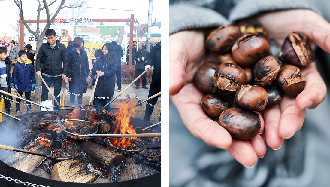 Visitors at the Gongju Chestnut Festival gather around a fire to roast chestnuts. © Yonhap News / Peeling off the burnt skin of roasted chestnuts is a seasonal ritual. © shutterstock