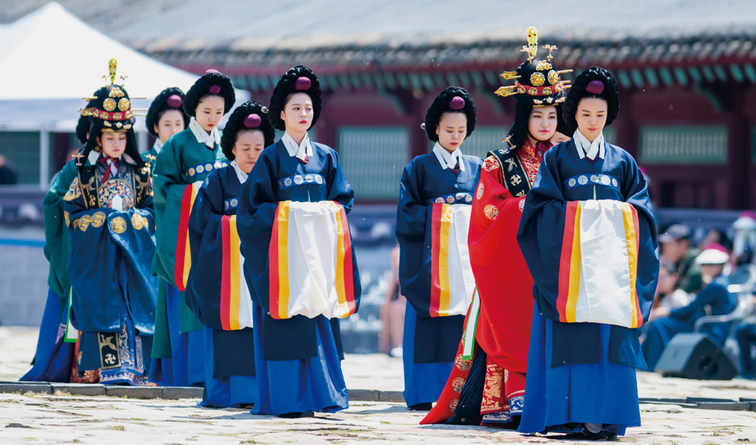 At the UNESCO World Heritage site Jongmyo Shrine, a palace ritual honoring ancestors is performed. The ceremonial attire worn by the Joseon princess has been restored from artifacts. © Getty Images Korea