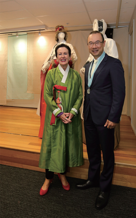 (Left) Sydney Mayor Clover Moore is clothed in Hanbok while standing next to city councilor Robert Kok (right). © Park Seon-ok