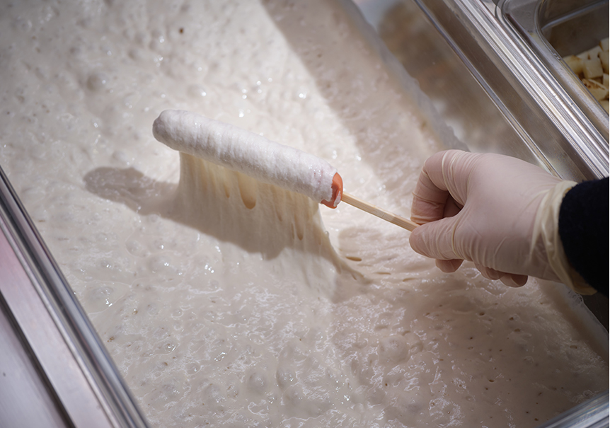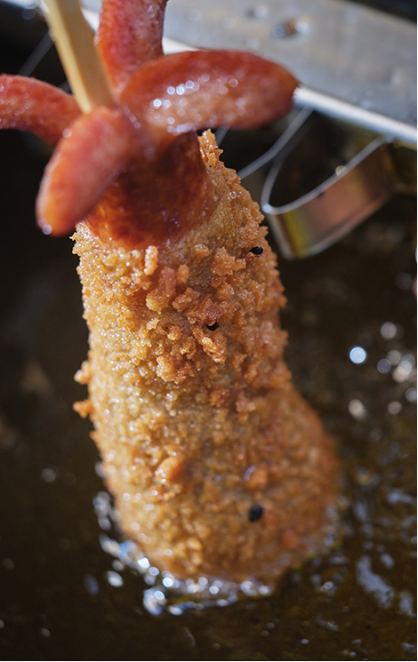 The creativity and variety of Koreanstyle corn dogs has seen the food’s popularity soar both at home and abroad, spurring many to consider K-corn dogs as the next big Hallyu export. Chung Chun Rice Dog is a New York-based chain of the specialty, while Myungrang Hot Dog started in Los Angeles’ Koreatown and has since opened branches in the U.S. states of Hawaii, Nevada, Georgia and Texas. K-corn dogs thus boast an array of dough, toppings and sauces that are sure to please hungry fans the world over.