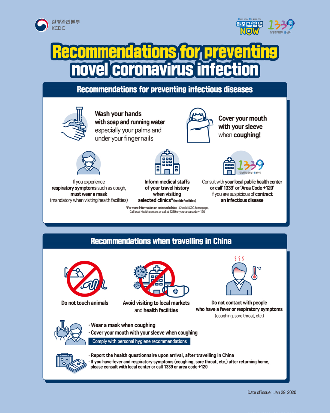 The Korean Centers for Disease Control and Prevention’s sign in English offers tips on how to prevent getting infected with the novel coronavirus. © Korean Centers for Disease Control & Prevention