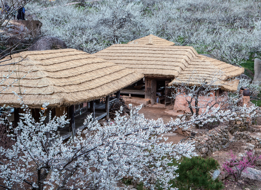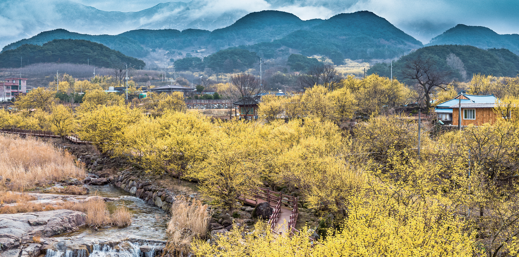 Jeollanam-do Province is renowned for its flowers. The mountain slopes of Gwangyang Maehwa Village light up with snowy plum blossoms, and magenta buds peek from Oknyongsa Temple Site Camellia Forest. In the vicinity, the yellow shade of cornus fruit flowers saturates Gurye Sansuyu Village its valleys, streams and even village alleyways. Spring flora have overtaken the rural mountainside villages of Jirisan Mountain.