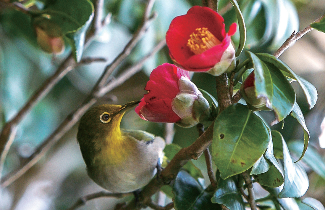 Nothing beats the affection for camellias like the bird white-eye. Inhabiting the forest, white-eyes consume honey and transfer pollen the way bees do for other flowers. This year, the white-eyes seem especially enthused by the forest’s yields. They sing in unison, sounding like reed pipes.