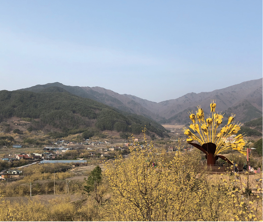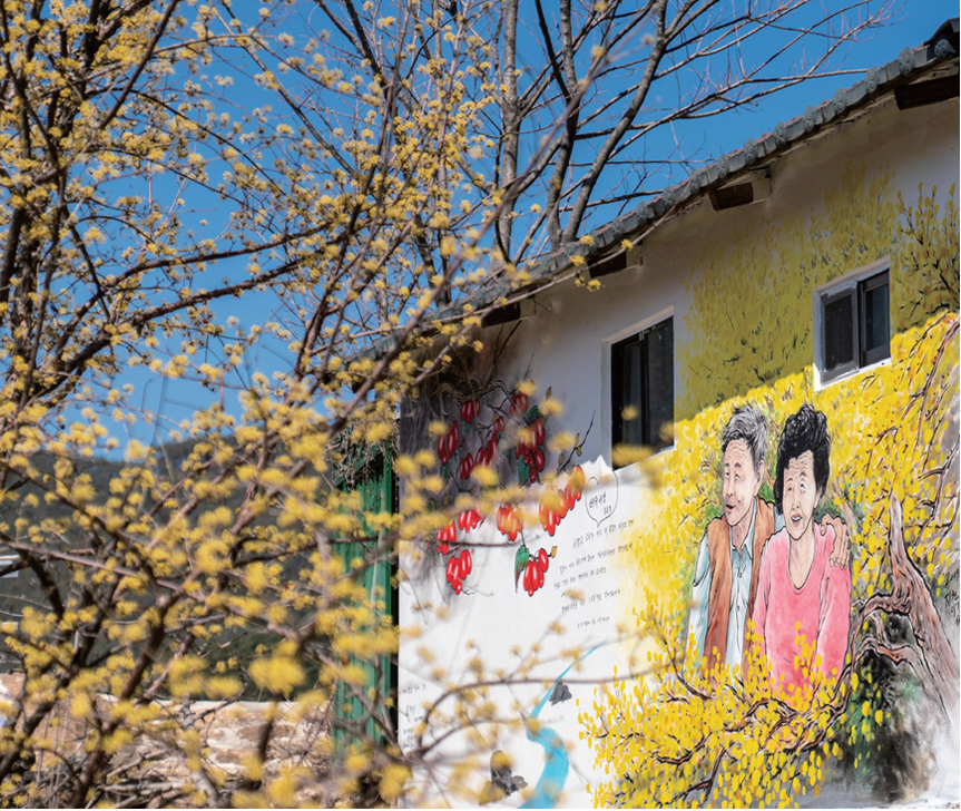 Wall paintings decorate the borders of Gurye Sansuyu Village. / A figure of cornus fruit flowers stands at Sansuyu Love Park in a village in Gurye-gun County, Jeollanam-do Province. © Gurye-gun County